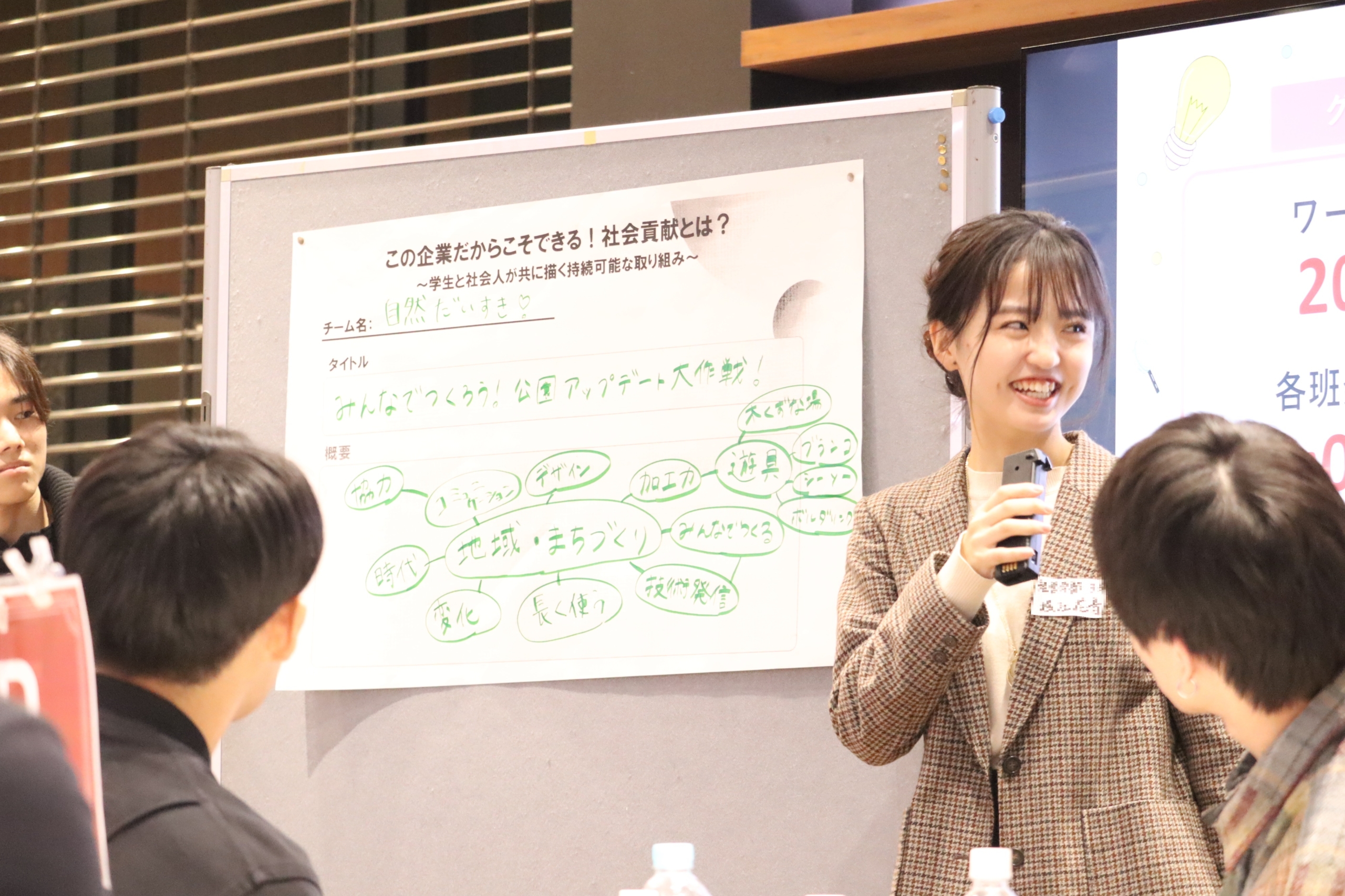 イベント前半は、前期〜夏休みに学生委員が企業へ直接取材・インタビューを実施!? 事業内容だけでなく、「働きがい」や「福利厚生」まで細かく調査し、参加者全員にレポートしました。リアルな情報が満載で、みんな真剣な表情でした! イベント後半は、企業の方を交えてのグループワーク! 「この企業だからこそできる!社会貢献とは?~学生と社会人が共に描く持続可能な取り組み~」というお題でディスカッションを行いました。企業の方のプロの視点と、学生の斬新なアイデアが混ざり合い、このイベントならではの面白い取り組み案がたくさん生まれました。学生たちには就活の場以外で、企業の方とじっくり語り合える貴重な機会となりました。 ご参加いただいた企業の皆様、学生委員の皆さん、ありがとうございました!