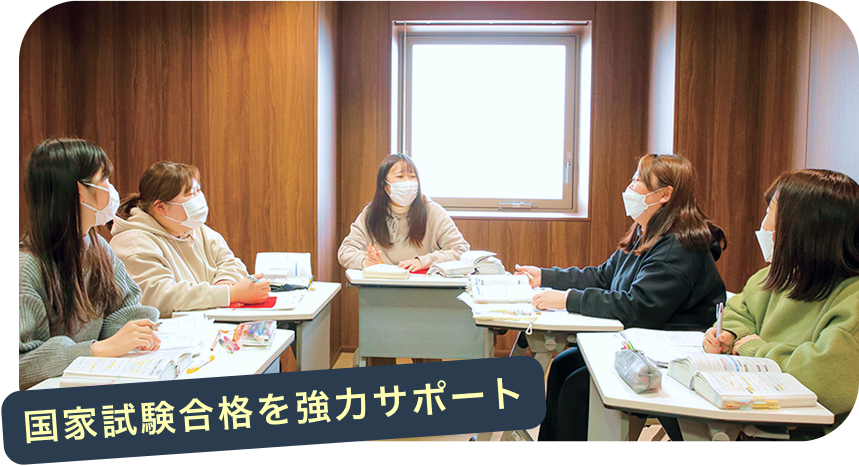各学科において、教え合い、高め合うグループ学習形式を採用しています。国家試験合格という同じ目標を持つ仲間と一緒なら、やり遂げられるはず。教員や先輩もアドバイザーとして、学習をサポートします。