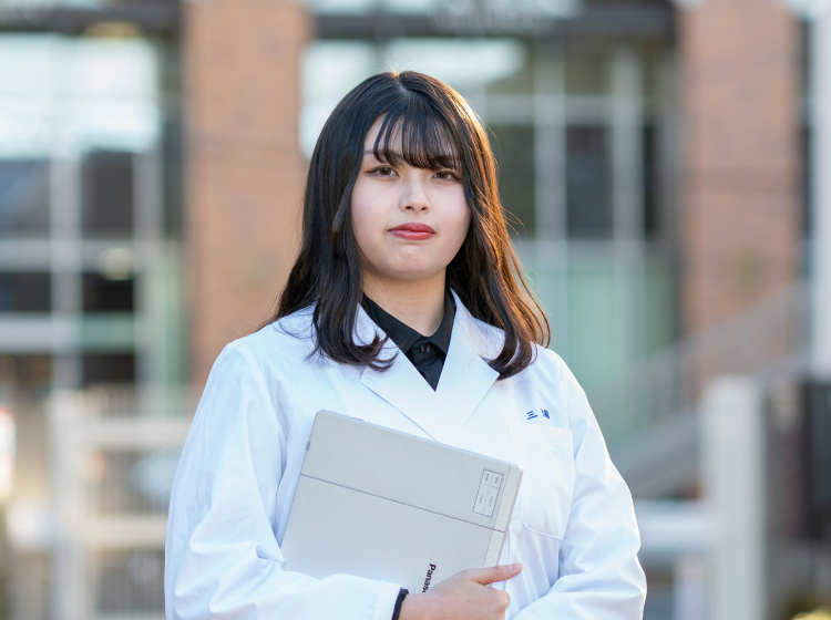 高校生の頃に好きだった理系の勉強を大学でも続けて将来の仕事につなげていきたいと考え、臨床検査技師を目指すようになりました。文京学院大学は設備が充実していて、臨床現場で使われているものと同等の機器を使って学ぶことができるので、臨床を学ぶうえで、充実した環境であると感じています。3年次後期からは臨地実習が始まりました。実際に患者さんを検査させていただく機会もあり、これまでの学びが実体験を通じて、より深く吸収できています。4年次からは病理学をテーマにした卒業研究に取り組みます。最も興味のある分野なので、学びを掘り下げられることが今から楽しみです。